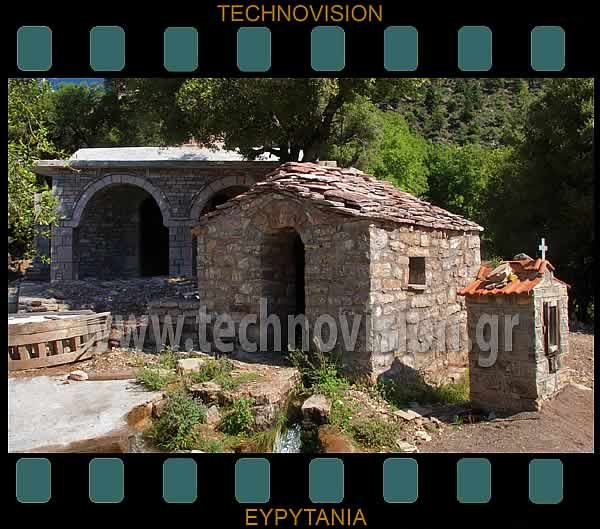 Άγραφα. Ο υδρονομέας του χωριού που χρονολογείται απο τους βυζαντινούς χρόνους και πίσω ο υπο ανέγερση ναός του Αγίου Νικολάου, ο οποίος χτίζεται πάνω σε θεμέλια παλιότερου που ανακαλύφτηκε το 1993.