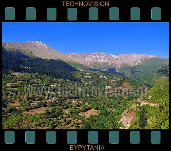Τροβάτο. Ο Άγιος Δημήτριος, οι Άγιοι Θεόδωροι και οι Χιόνες, με φόντο το Αυγό του Ντεληδημιού (2162μ.) και την Αφωρισμένη.