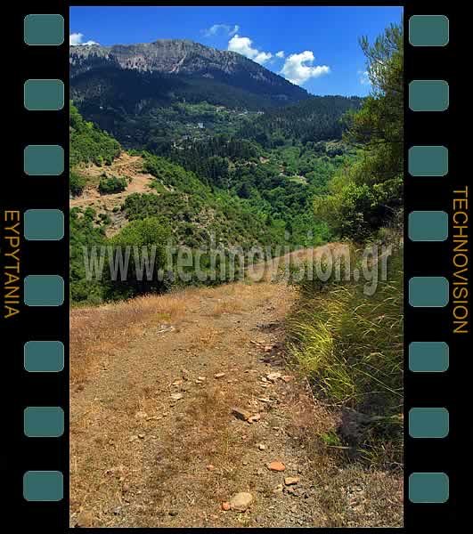 Κάστρο Λημερίου. Ο δρόμος με διάσπαρτα κεραμικά όστρακα που παρέσυρε. Απέναντι το Λημέρι.