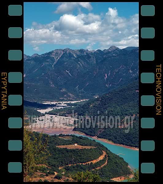 Τσούκα. Η γέφυρα του Μανώλη κάτω δεξιά μές τα νερά της λίμνης, με φόντο τα βουνά των