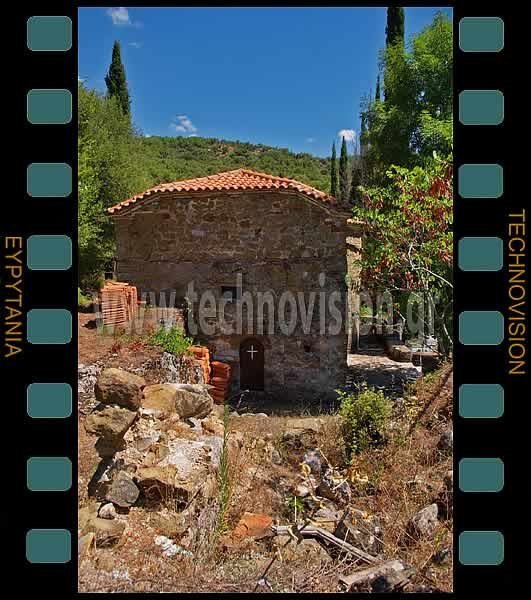 Ανατολική Φραγκίστα. Η μονή Γέννηση Της Θεοτόκου που βρίσκεται στο νεκρταφείο του χωριού. Μροστά μας ερείπεια κελιών.