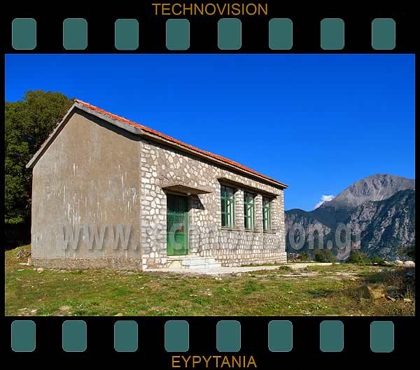 Δερμάτι. Το Δημοτικό Σχολείο. Απέναντι η Καλιακούδα (2098μ.).