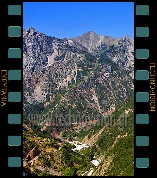 Το Δερμάτι στις νότιες παλγιές της Χελιδώνας (1973μ.) και κάτω τα Διπόταμα.