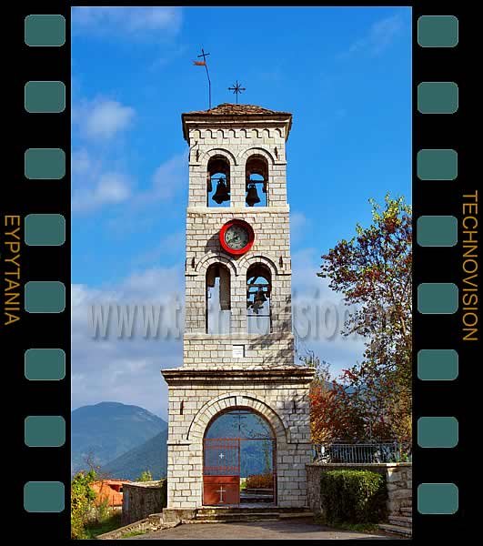 Μικρό Χωριό. Το καμπαναριό - ρολόι του ναού. Χτίστηκε το 1894. Αντί για αριθμούς, τις ώρες υποδεικνύουν γράμματα που σχηματίζουν το όνομα της κόρης του δωρητή Δ. Γ. Σιδέρη από την Κωνσταντινούπολη.