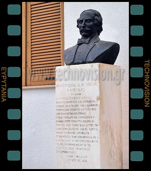 | -Προυσός. ΑΝΑΣΤΑΣΙΟΣ Δ. ΑΓΑΘΙΔΗΣ - ΚΑΠΕΡΔΑΣ (1794-1881). "ΕΝ ΠΡΟΥΣΩ, ΓΕΝΝΗΘΕΙΣ ΚΑΙ ΕΝ ΛΟΝΔΙΝΩ, ΔΙΑΒΙΩΣΑΣ ΚΑΙ ΑΠΟΘΑΝΩΝ. ΕΞΟΧΟΣ ΔΙΔΑΣΚΑΛΟΣ ΤΩΝ ΕΛΛΗΝΙΚΩΝ ΓΡΑΜΜΑΤΩΝ ΕΓΕΝΕΤΟ ΚΑΙ ΠΟΛΛΟΥΣ ΤΩΝ ΕΛΛΗΝΟΠΑΙΔΩΝ ΣΟΦΩΣ ΕΠΑΙΔΕΥΣΕΝ, ΕΝ ΟΙΣ ΧΑΡΙΛΑΟΝ ΚΑΙ ΣΟΦΙΑΝ ΣΠΥΡ. ΤΡΙΚΟΥΠΗ. ΘΑΝΩΝ ΔΕ ΤΗΝ ΜΕΓΑΛΗΝ ΠΕΡΟΥΣΙΑΝ ΑΥΤΟΥ ΤΗ, ΓΕΝΕΤΕΙΡΑ, ΚΑΤΕΛΙΠΕ ΚΑΙ ΕΚ ΤΑΥΤΗΣ ΣΧΟΛΗ ΕΠΩΝΥΜΟΣ ΙΔΡΥΘΗ, ΕΠΙ ΟΓΔΟΗΚΟΝΤΑΕΤΙΑΝ ΔΙΑΛΑΜΨΑΣΑ, ΕΝ Η, ΕΚΑΤΟΝΤΑΔΕΣ ΕΠΑΙΔΕΥΘΗΣΑΝ ΚΑΙ ΕΝ ΤΩ, ΒΙΩ, ΗΥΔΟΚΙΜΗΣΑΝ. ΟΥΤΟΙ ΤΩ, ΕΥΕΡΓΕΤΗ, ΤΟΔΕ ΤΟ ΜΝΗΜΕΙΟΝ ΕΥΓΝΩΜΟΝΟΥΝΤΕΣ. ΑΥΓΟΥΣΤΟΣ 1972.". Δίπλα ακριβώς η είσοδος της "Αγαθίδειου Βιβλιοθήκης". |
