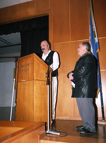 Ο Πρόεδρος του Πολιτιστικού Συλλόγου Καρπενησίου κ. Σπύρος Τσιούρης, στο βήμα πριν την παράσταση. Δίπλα του ο δραστήριος Πρόεδρος της Πανευρυτανικής, κ. Κώστας Παπαδόπουλος.