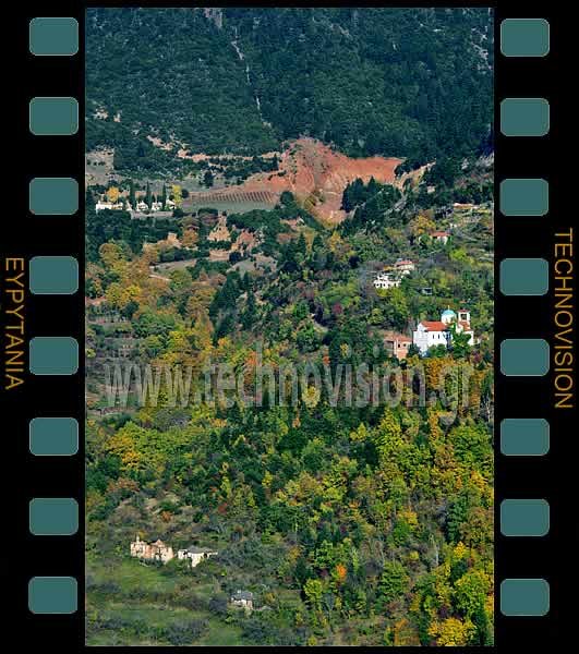 Καλεσμένο. Πάνω αριστερά το κοιμητήριο του χωριού, δεξιά ο Άγιος Ιωάννης και κάτω αριστερά τα εγκαταλελειμμένα