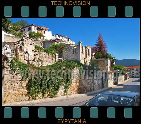 Οδός Ζηνοπούλου. Τα ερείπια από το σπίτι του νομοδιδάσκαλου Κωνσταντίνου Τριανταφυλόπουλου. Σήμερα ιδιοκτησίας Ιδρύματος "Γαζή". Δίπλα δεξιά, βρίσκεται η οικία οικογένειας Οικονομίδη. Στη θέση της κατά τα χρόνια της τουρκοκρατίας, υπήρχε ο πύργος του προεστού και πρώην αρματολού Δημητράκη Παλαιόπουλου. |