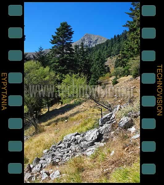 Θέση Πέτρα. Ερείπια κτίσματος. Στο φόντο η Ψηλή Κορυφή του Βελουχιού (2312μ.).