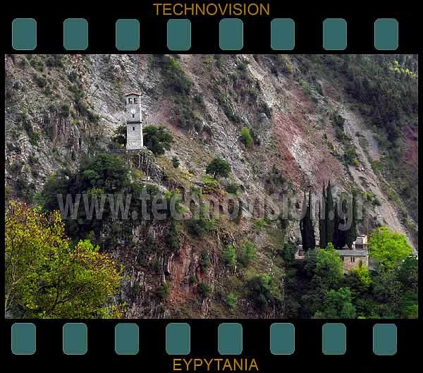 Μονή Προυσού. Το ρολόι και δεξιά οι Άγιοι Πάντες με το βαφτιστήριο και το κρυφό Σχολείο.