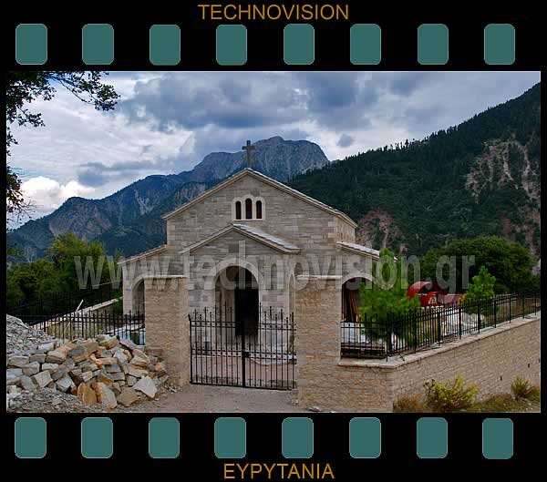 Άγιος Γεώργιος. Ο ομώνυμος ναός του οικισμού. Απέναντι η Καλιακούδα (2098μ.).