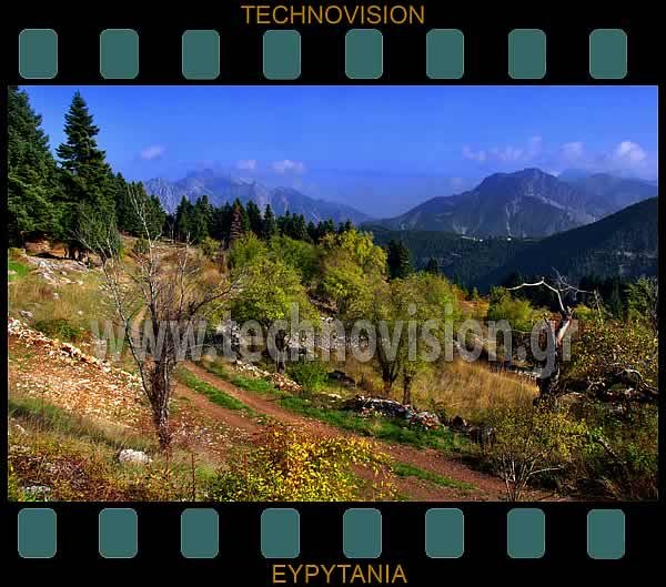 Τόρνος. Θέση "Μεγάλη Βρύση". Το εγκαταλειμμένο χωριό. Στον ορίζοντα αριστερά η Χελιδώνα (1973μ.) και δεξιά η Καλιακούδα (2098μ.).